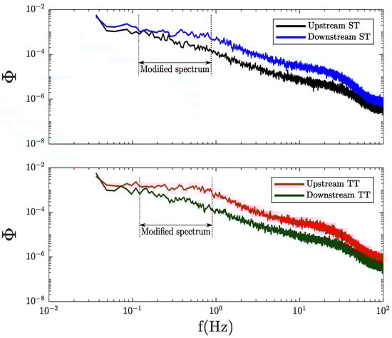 To characterize the turbine influence on the flow hydrodynamics, we calculated the longitudinal velocity spectra showed in Figure 8 for a point located upstream of both turbines and a second point located at a distance of downstream of the primary turbine, both at the hub height and at the flume centerline. We observed that at lower frequencies, there were significant changes between the upstream and downstream spectra, highlighting the influence of the upstream turbine on the low frequency region, consistent with the voltage spectrum. For both cases, the areas under the plot are larger for the downstream point, which suggests a greater performance variability for the TT case, as expected.