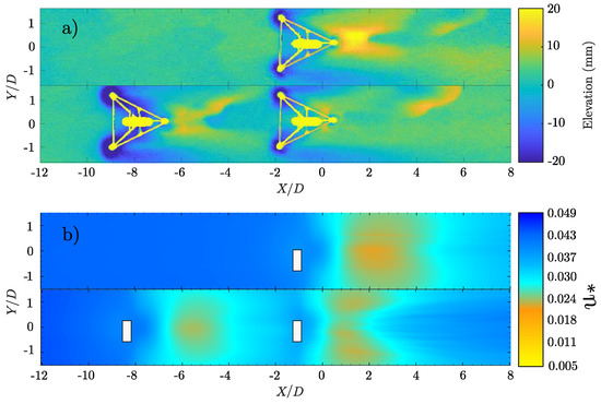 The shear stress, represented by the spatial distribution of , is shown in Figure 9b. The magnitude of the time-averaged shear velocity indicated a portion of the bed where scouring or deposition was favored. In the ST simulations, we observed a low zone between 1D and 4D downstream of the primary turbine, which coincided with the experimental results. However, the shape of this zone differed from measurements, since the V-shaped deposition observed in the experiments downstream of the turbines was not present in the patterns of , due to the absence of the support structure in the model. For the TT case, between the rotor and , the results were similar.