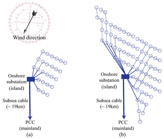 The radial design for an OWF collection system was shown to be the most cost-effective option in an earlier study [8]. Herein, based on engineering judgments, radial designs are considered for both the OWFs rated 100 MW and 300 MW as shown in Figure 3. To maximize wind energy usage as well as reduce wake effects, turbines sit perpendicular to the main wind direction and in rows spacing 3.6 rotor diameters (D) within each row and 7 D between rows as recommended in [27].