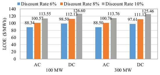 A comprehensive economic evaluation was performed by using the estimated cost-benefit analysis components. The estimated LCOEs for different discount rates are shown in Figure 4. The results reveal that the LCOE deviates from 88.34 $/MWh (AC 100 MW with 6 % discount rate) to 126.60 $/MWh (DC 100 MW with 10 % discount rate) depending on the electrical topology, interest rates and wind farm size. It can be observed that, although wind farm size is increased by three-fold, LCOEs for the AC and DC options slightly change.