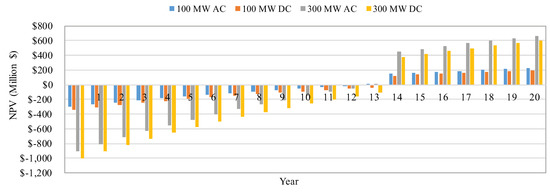 Figure 5 shows the NPV distribution over the entire lifespan of the OWF. It is proved that AC and DC options for larger wind farm size (e.g., 300 MW) are delivering a better NPV performance in comparison to the 100 MW wind farm size. DPBP for the AC configuration is found to be 13 years while it is 14 years for the DC options. The one year difference is due to higher CAPEX in DC options which is mainly contributed by the converters’ cost. The economic performance of the investigated electrical topologies in terms of NPV for various interest rates with the maximum FIT option is demonstrated in Figure 6. The 300 MW AC configuration under 6 % discount rate yields the best results with a NVP (i.e., 667 million$). Contrarily, the 100 MW DC option under a 10 % discount rate yields the worst performance in terms of NVP (i.e., 37 million). It is also shown that the OWF is economically viable for all interest rates considered for selected configurations and wind farm sizes. Nevertheless, the investigated OWF with both AC and DC electrical topologies for the 300 MW wind farm size is a superior investment option in case the discount rates are in the 6% range with the maximum FIT.
