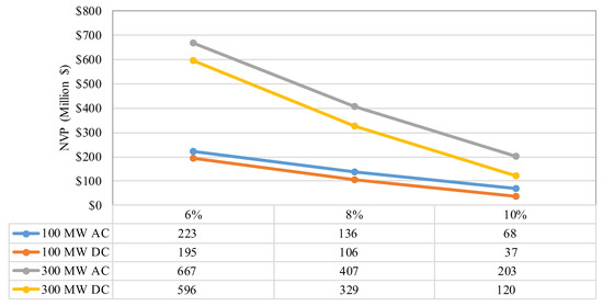 The variation of NPV of the OWF in terms of discount rates for AC and DC configurations.