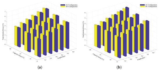 Losses evaluation for AC and DC configurations with respect to capacity factor and transmission line length: (a) 100 MW layout. (b) 300 MW layout.