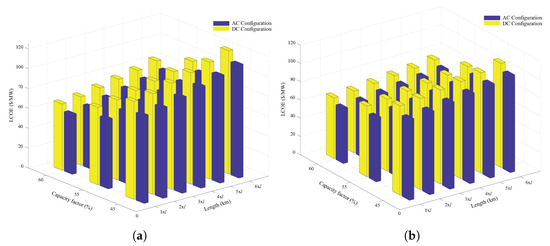 LCOE evaluation for AC and DC configurations with respect to capacity factor and transmission line length: (a) 100 MW layout. (b) 300 MW layout.
