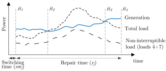 Switching and repair times in Figure 2 are analysed separately because the restoration of supply is evaluated only during the repair time. For fault j, and are defined as the index and set of time-steps in the switching time, while t and are the index and set of time-steps in the repair time. Also and are defined as the duration in hours of each time-step in the switching and repair times, respectively.