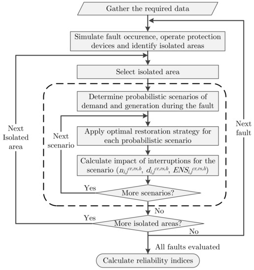 The first step to assess reliability is to gather all the required data (it is assumed that data are robust and reliable). Then, the impact of each component failure is evaluated, and this starts by simulating the operation of the protection devices and by identifying the isolated areas created [31]. For each isolated area, probabilistic scenarios for demand and generation are defined over a year (more details in Section 4). After that, the adequacy of generation and demand is assessed for each defined scenario. The procedure described in Section 5 is used to model the optimal restoration and to determine the impact of the interruptions. Finally, the reliability indices are calculated.