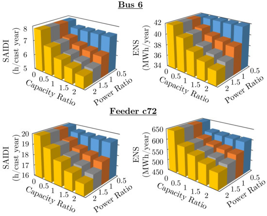 Figure 5 shows the SAIDI and ENS indices obtained for the described analysis. In the figure, the largest evaluated energy storage size (ratios of 2) reduced SAIDI of Bus 6 system from 7.9 to 5.8 h/customer and ENS from 43.5 to 36.6 MWh/year. For Feeder c72 system, SAIDI was reduced from 21.2 to 17.1 h/customer and ENS from 650 to 528 MWh/year. These results proved that the size of energy storage has an important impact on the reliability improvement. However, this reliability improvement substantially depends on the combination of capacity and rated power as it can be seen in Figure 5. In addition, the reliability improvement tends to saturate at capacity and power ratios larger than 1.5. All these results highlight the importance of selecting adequate capacity and rated power of energy storage in order to meet a specific reliability improvement.