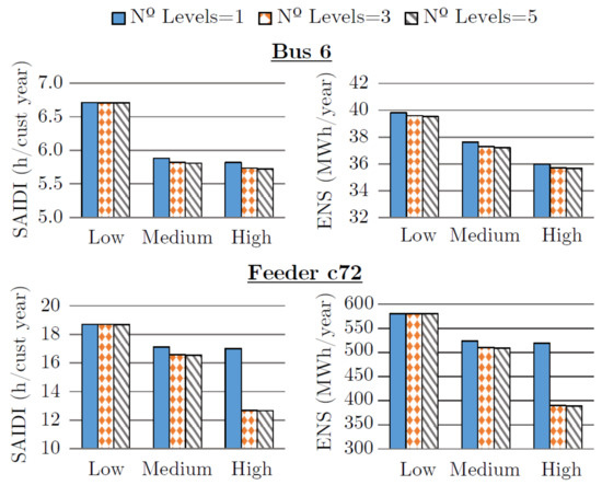 With respect to the levels of load shedding per load point, increasing their number from 1 to 3 hardly improved reliability indices in Bus 6 (1%). In the case of Feeder c72 system, this improvement presented relevant differences depending on the scenario: no improvement for Low, 3% for Medium and 25% for High. In contrast, in both test networks, increasing the number of levels from 3 to 5 had insignificant extra improvement. These differences were influenced by the power magnitude of the levels and demonstrate the need of considering this parameter in the reliability assessment.