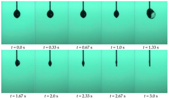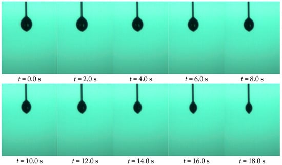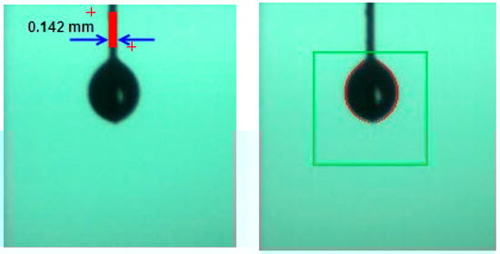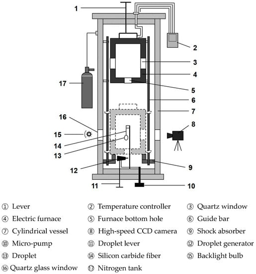 A schematic drawing of our experimental test is shown in Figure 1. The droplet evaporation test was achieved using a cylindrical setup. A high-speed CCD camera recorded a droplet size variation. An electric furnace with two guide rails was implemented inside the chamber. The bottom of the electric furnace had an opening for smooth introduction of a droplet. Electric heaters were placed and insulated at both sides of the furnace. The electric coil was protected by a ceramic shield to avoid direct radiation. The two quartz windows were installed at the other two walls for an observation of the droplet behavior. A support made of silicon carbide fiber was located at the chamber bottom. And it is easily observed through the quartz windows of the furnace. More details of the experimental apparatus are available in [16,17]. The ambient temperature in the chamber was changed from 100 °C to 600 °C by 100 °C. The initial droplet diameter was in the range of 1.0 ± 0.1 mm. The recorded droplet images were post-processed using the Visual Basic program. First of all, the number of pixels inside droplet was counted, while the droplet diameter is estimated by a comparison with the number of pixels according to the fiber width. Figure 2 shows an example of image processing at a single droplet.