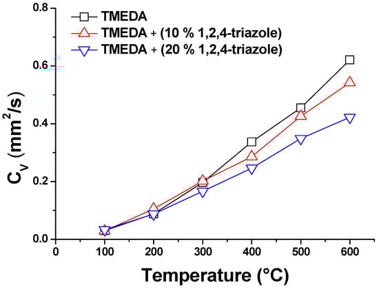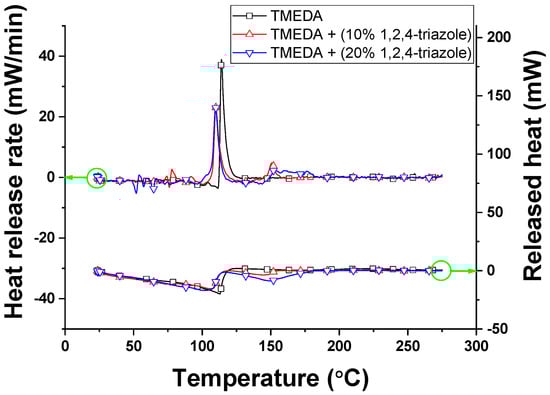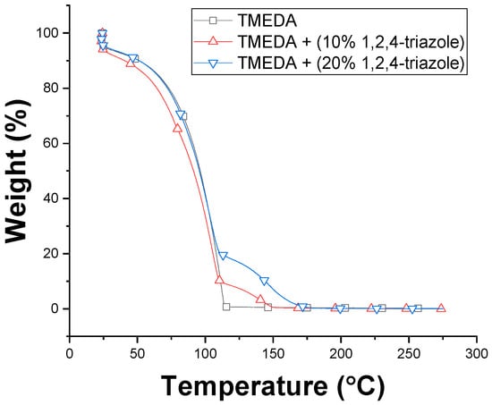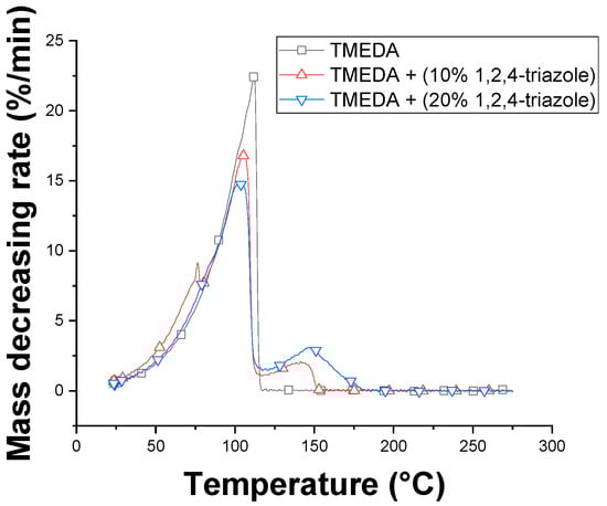In the thermal decomposition period, TMEDA began to evaporate at temperature before reaching its boiling point and 1,2,4-triazole evaporate subsequently. The thermal decomposition temperatures of TMEDA, TMEDA + (10% 1,2,4-triazole) and TMEDA + (20% 1,2,4-triazole) were 114.1 °C, 110.0 °C, and 109.7 °C, respectively.