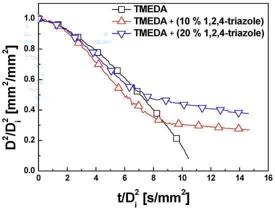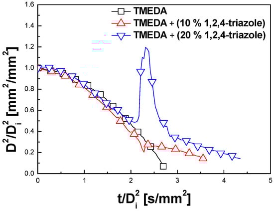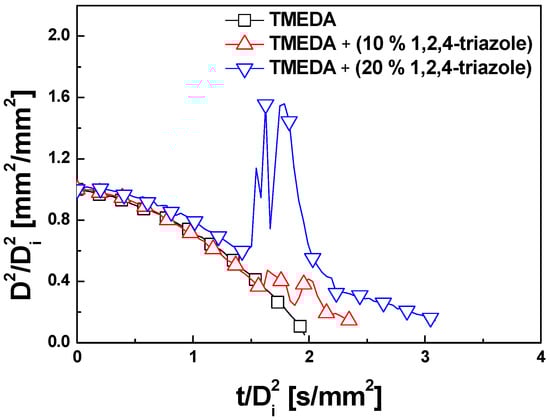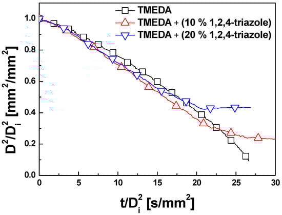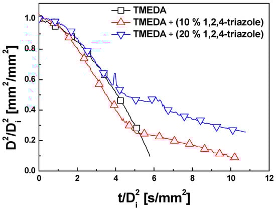 Figure 6 illustrates the normalized squared diameter change ( D 2 / D i 2 ) with normalized time ( t / D i 2 ) at 100 °C. Its sequential images of the evaporation TMEDA droplet were indicated in Figure 7. These results display a steady state evaporating period without any heavy fluctuations. After an initial heating up duration, the droplet diameter squared reaches an almost linear variation with time (D2-law). In Figure 6, after approximately 20 s/mm2, the slopes of TMEDA + (10% 1,2,4-triazole) and TMEDA + (20% 1,2,4-triazole) were changed slightly. In addition, in Figure 8 and Figure 9, the variations of evaporation rates were observed, too. These changes of gradient were attributed to the amount of 1,2,4-triazole in the blended fuel. Therefore, the evaporation history of TMEDA-based fuels specifies two different stages: vaporization of TMEDA before puffing and vaporization of the remaining 1,2,4-triazole fuel.