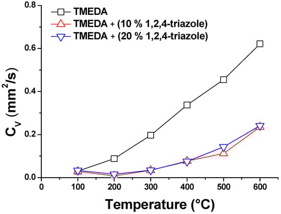 Figure 15. Evaporation coefficients of the TMEDA-based fuels at temperatures of 100–600 °C for the first stage evaporation period.