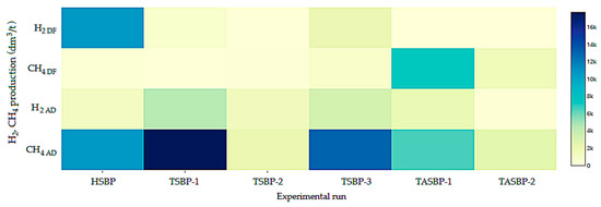 Heat map produced using data from mass balance. The columns of the heat map represent hydrolysates and the rows represent H2 and CH4 production (CH4AD, H2AD—without pretreatment; CH4DF, H2DF—with pretreatment). Each cell is colorized based on the level of gas volume from 1 t of fresh sugar beet pulp. (HSBP—enzymatically hydrolyzed sugar beet pulp; TSBP—thermally pretreated sugar beet pulp; TASBP—thermochemically pretreated sugar beet pulp).