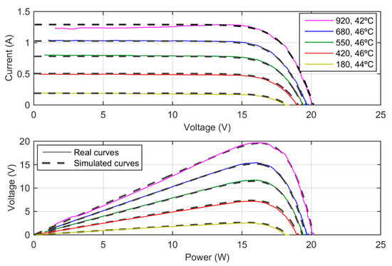 In addition, the module was previously simulated in Matlab-Simulink to obtain the characteristics curves, current–voltage (I–V) and power–voltage (P–V). Those curves are presented in Figure 2 with different irradiation conditions (simulation and experimental results). The model used in the simulation was presented by the authors in [31].