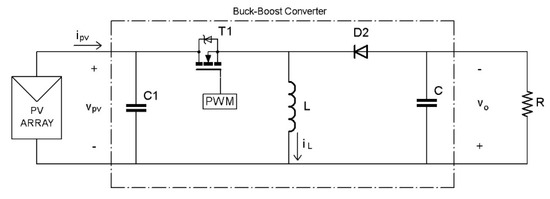With respect to the DC/DC converter, a buck-boost topology was designed to convert the voltage from one level to another lower or higher depending on the load requirements. Figure 3 represents the equivalent circuit of a buck-boost converter. As can be seen in the figure, the components of the buck-boost converter are two capacitors, an inductor, a transistor (in this case a MOSFET), T1, and a diode, D2. The use of the diode and the transistor implies the load works as a non-linear. In Figure 3, vPV is the PV output voltage or the buck-boost converter’s input voltage in V, iPV is the PV modules’ output current, iL is the inductor current, and vO is the DC/DC converter’s output voltage, whereas R is a resistor, L an inductor, and C1 and C are capacitors. They are constant parameters.
