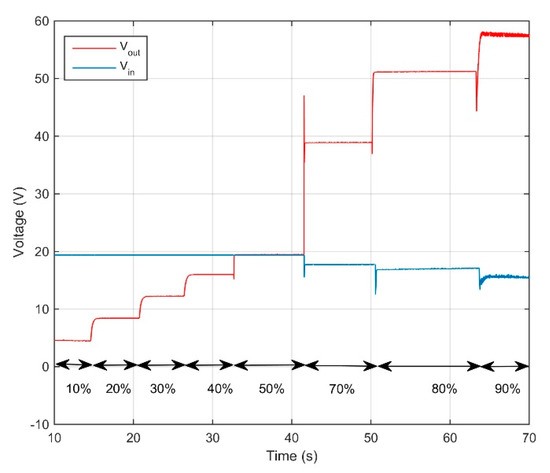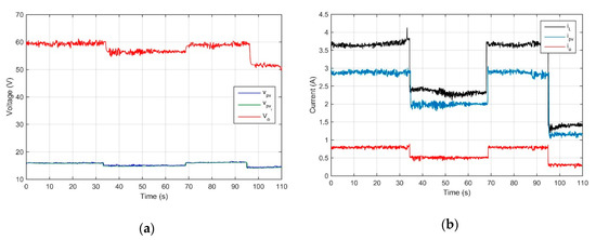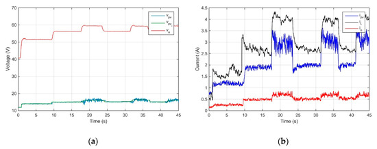 Figure 8 depicts the voltage and current transient response when there are step irradiance changes. Figure 8a shows the reference voltage to be achieved by the control at the PV modules’ output or DC/DC converter’s input, even when there are changes in the irradiance. The buck-boost converter’s measured input voltage is shown in the figure, reaching the reference voltage values in all the cases. The DC/DC converter’s output voltage is also presented in this figure. As expected, the converter’s input voltage changes with the irradiance; both increase and decrease together.
