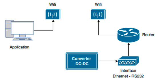 As a different possibility, a router with a wireless interconnection is included into the platform, to send the data via Wi-Fi. To do that, the base station running the application is required, with a Wi-Fi communication system using the user datagram protocol (UDP). Figure 6 presents the scheme of the interconnected system. The PC is connected to the router that allows the Wi-Fi communication and the DC/DC converter is connected through the Ethernet interface RS232 to the router. The communication between DC/DC converter–PC are by Wi-Fi with a latency of 5 ms, Figure 7.
