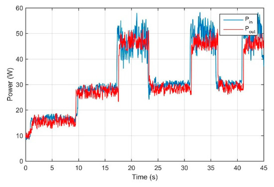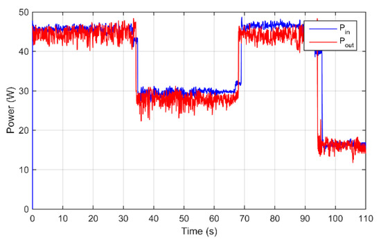 Then, Figure 12 shows the power at the input and output buck-boost converter, defining the converter efficiency. In this case, the efficiency of the DC/DC converter ranges from 93.2% to 94%. As in the previous case, the voltage, current, and power values increase when the irradiance increase, whereas the values decreases when the irradiance goes down. Table 3 summarizes those results.