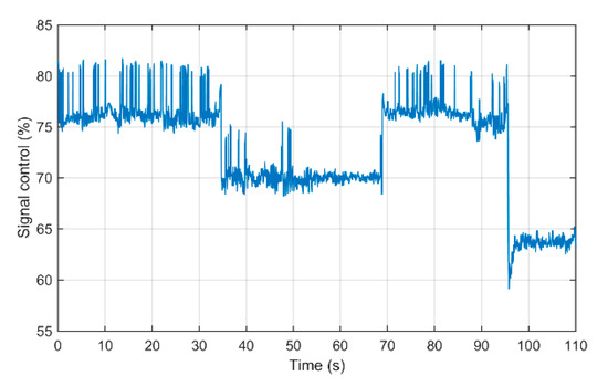 Experiments under different conditions were conducted to verify the sliding control performance. In this sense, there are different step signals that represent changes in the incident irradiance over the PV modules. Step signals were used to test the control, although the real irradiation changes are smooth due to the progressive appearance of the clouds. Thus, we tested the control in even worse conditions to verify the robustness. The system was tested with different irradiances, 670 W/m2 until 33 s, 490 W/m2 until 68 s, and 690 W/m2 until 95 s, to finish with an irradiance of 330 W/m2.