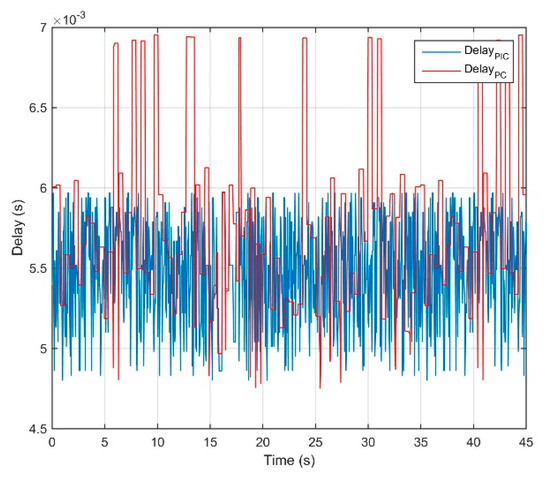 The delay in the data processing and the data transmission packets with the packaged data from the microcontroller to the base station, and vice versa, are depicted in Figure 13. These measurements were taken when the experiment was conducted. The values were obtained independently from the PC and from the dsPIC, showing a mean value of time of 5.4 ms.