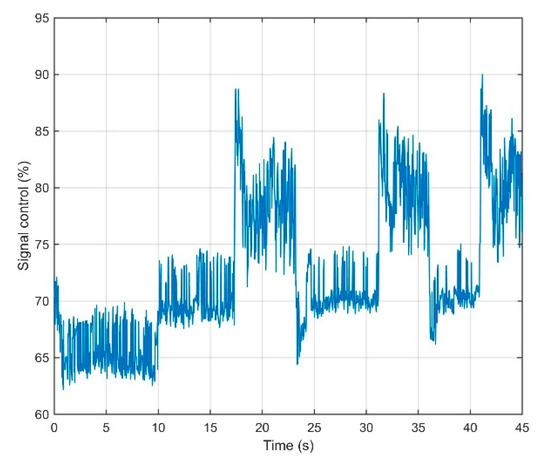 Figure 14 presents the control signal. As in Figure 11 and Figure 12, it is shown that the control changes when the irradiance changes as well, in order to make the system remain in the sliding surface. It also depicts the effect of the discontinuous control non-linearities, but in this case with more noise.