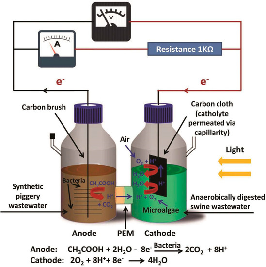 - Commault, A.S.; Laczka, O.; Siboni, N.; Tamburic, B.; Crosswell, J.R.; Seymour, J.R.; Ralph, P.J. Electricity and biomass production in a bacteria-chlorella based microbial fuel cell treating wastewater. J. Power Sources 2017, 356, 299–309. [Google Scholar] [CrossRef]