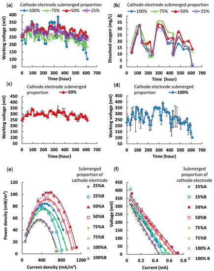 Electricity generation by the microbial fuel cell (MFC) reactors with the cathode electrodes submerged at the proportions of 25%, 50%, 75%, and 100% on 1 kΩ external resistance. (a) Working voltage; (b) Dissolved oxygen in the catholyte; (c) Working voltage with the 50% submerged cathode electrodes; (d) Working voltage with the 100% submerged cathode electrodes (e) Power density; (f) Polarization curve. A and B refer to the data from the two identical reactors in the same test group. The data showed in (a–d) were the average values of the two identical MFCs within each test group.