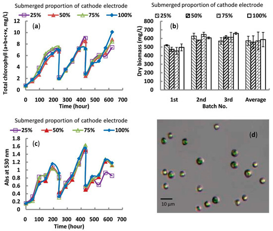 As illustrated in Figure 2a,c,d, the working voltages in the groups with partially submerged (25%, 50%, and 75%) electrodes were much more stable than those with 100% submerged electrodes in biocathode, despite similar large fluctuations (1.0–35.4 mg/L) in DO levels (Figure 2b) with the growth of microalgae (Figure 3a). The working voltage in the MFCs with 25% submerged cathode electrodes just changed from 256 to 239 mV, whereas that of the 100% submerged one fell from 259 to 102 mV, when their DO in the catholyte dropped from 13.6–14.8 mg/L to 1.0–1.6 mg/L at the end of the 3rd batch culture. These observations indicate that the performance of the partially submerged cathode electrode was more stable than the completely submerged ones and applicable to variable environmental conditions. One possible explanation is that the partially submerged electrode could access the O2 from the air as a supplement to maintain a relatively high working voltage output when the DO generated by microalgae was not enough for the cathodic reaction. However, the working voltages generated from completely submerged electrodes varied remarkably with the DO from microalgae, as previous studies reported [6,8,9], because the O2 originates solely from DO present in the catholyte.