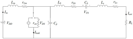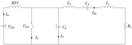 MOSFET’s turn-on resistance, leakage current and inductance resistance in the load network are considered in the circuit diagram of a class-E power amplifier in Figure 2. MOSFET’s loss can be divided into the on-resistance loss and the leakage current loss in turn-off state. Inductance resistance comes from choke (parallel inductor) Lin resonant inductor L0 and inductance of phase angle compensation Lx.