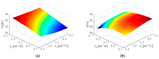 In order to analyze the effect of Lx (Lin) and Cp on the output characteristics of class-E power amplifier, the surface graph of its parametric characters is obtained based on the steady-state matrix method. In the following analysis, MRF6V2150NBR1 is used so that MOSFET’s turn-on resistance Ron is 0.3 Ω, the leakage current Ileak is 2.5 mA, and drain source maximum withstand voltage is 110 V.