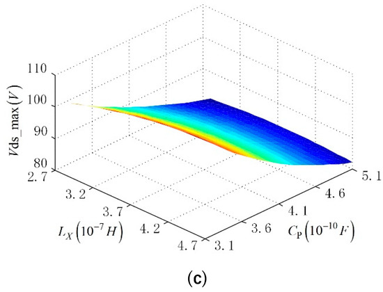 With the increase of Lx and Cp, the output power of the RFC type decreases significantly, the efficiency increases firstly and then decreases. The trend of output efficiency is opposite to the trend of output power, and the influence of the two factors should be considered comprehensively in the design of circuit parameters. Moreover, Lx has little effect on the maximum voltage of MOSFET, and its value decreases mainly with the increase of Cp, which can be obtained from Figure 3.