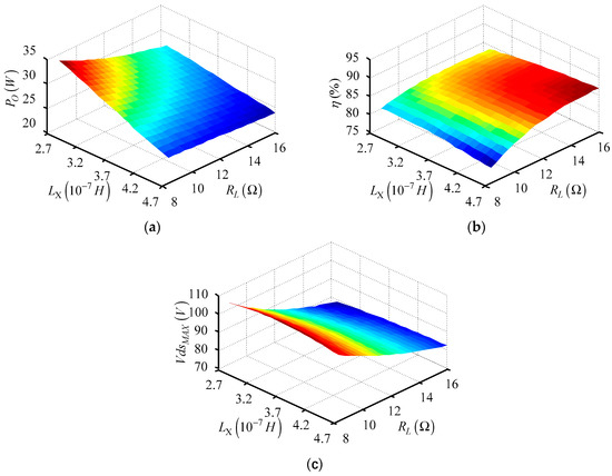 It can be seen from Figure 4 that the output power of the class-E power amplifier decreases while the efficiency increases with the increase of RL. The effect of load RL on output power is obvious, while the trend of the output efficiency is opposite to that of the output power. On the other hand, Lx has less influence on the maximum voltage of MOSFET than RL. However, within the variation range, the voltage peak across the MOSFET is smaller than its maximum value, ensuring that the MOSFET can work normally without being broken down.