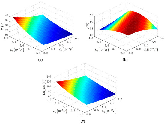 (a) Output power of PCL changing with Lin and Cp; (b) output efficiency of PCL changing with Lin and Cp; (c) peak voltage of PCL changing with Lin and Cp.