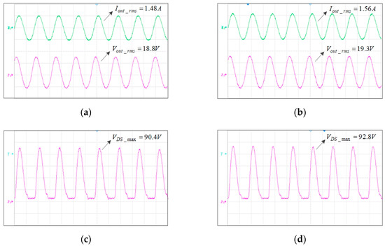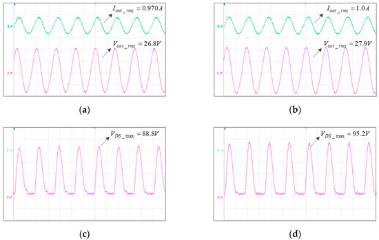 The experimental waveforms of PCL type before and after optimization are shown in Figure 8. Before optimization, the RMS of the output current of PCL type was 0.97 A, the output voltage was 26.8 V and the output power was 25.99 W; the efficiency was 85.57%. After optimization, the RMS of the output current of RFC type was 1.0 A, the output voltage was 27.9 V, and the output power was 27.90 W; the efficiency was 85.84%. Under the condition that the output efficiency had no obvious change, the output power increased by 1.91 W (7.35%). The maximum withstand voltage of MOSFET was increased from 88.8 V to 95.2 V, but still within the safe range.