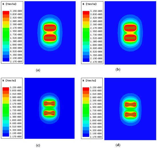 (a) Simulation result of B-field strength in case 1; (b) simulation result of B-field strength in case 2; (c) simulation result of B-field strength in case 3. (d) simulation result of B-field strength in case 4.