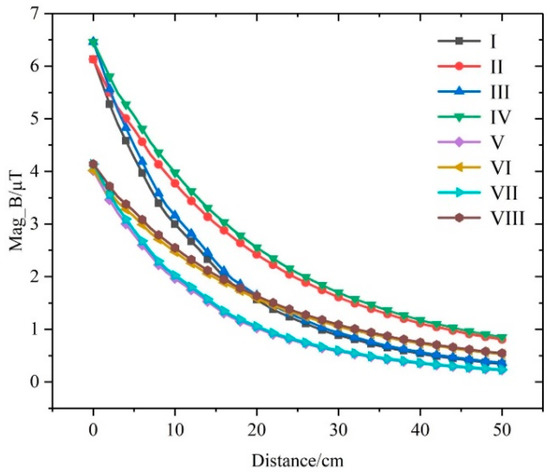 The trends of the B-field strength along two lines in four cases are shown in Figure 11. ‘I’ represents B-field strength in case 1 along the y-axis; ‘II’ represents B-field strength in case 1 along the z-axis; ‘III’ represents B-field strength in case 2 along the y-axis; ‘IV’ represents B-field strength in case 2 along the z-axis; ‘V’ represents B-field strength in case 3 along the y-axis; ‘VI’ represents B-field strength in case 3 along the z-axis; ‘VII’ represents B-field strength in case 4 along the y-axis; ‘VIII’ represents B-field strength in case 4 along the z-axis. B-field strength around the system with the RFC-type is stronger than that with the PCL-type, while the B-field strength after optimization was stronger than that before optimization. In general, the B-field strength in the four cases was always less than 27 μT which is the reference level for general public exposure formulated by ICNIRP-2010.