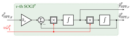 Since only one harmonic component can be detected with one SOGI, it is straightforward to implement SOGIs for different harmonic components in parallel. Moreover, note that for the low- & high-pass filtered input signal (see Figure 1) with , the harmonic component as in (10) is not available for implementation. However, it may be approximated by