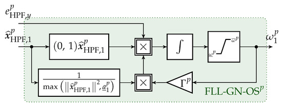 The most severe case for the SOGI-FLL are negative frequencies, since this might lead to instability of the overall system; moreover, a frequency equal to zero will stop the FLL from working, due to the GN (see (17)). In conclusion, the estimated angular frequency must be kept positive for proper functionality, which can be achieved by an output saturation (OS), which limits the frequency to a lower boundary . Since the frequency usually lies within a certain range, additionally, an upper boundary can be used. In [37], the authors already proposed an output saturation; however, they did not include a Gain Normalization as in [9], but extended the OS by an anti-windup strategy with a feedback gain, which, in the opinion of the authors, can destabilize the FLL (but not the SOGI!). The FLL, including a GN and OS (FLL-GN-OS), is shown in Figure 3.
