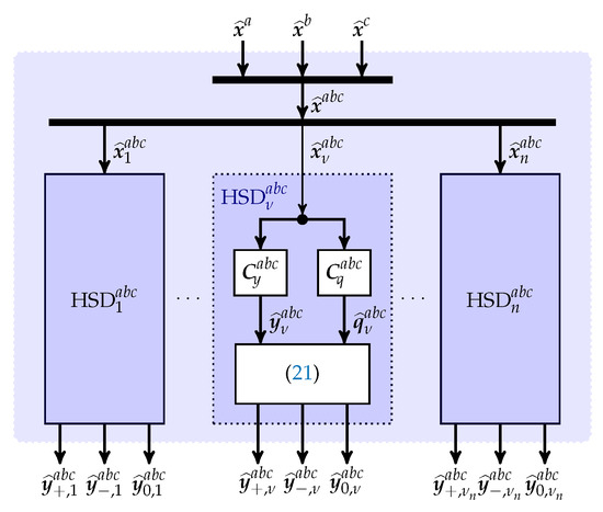 The principle idea of the proposed overall solution is illustrated in Figure 1. The depicted block diagram is fed by the input signals , , and of the respective phases , and shows the individual phase variables detection (PVD) blocks for the three phases and the harmonic sequence detection (HSD). The outputs of the block diagram are the respective estimated signal components (see Section 1.1). In Figure 1, all components (sub-blocks) of PVD are explicitly shown. PVD and PVD have identical components. One can summarize: For and , each PVD consists of the following sub-blocks: