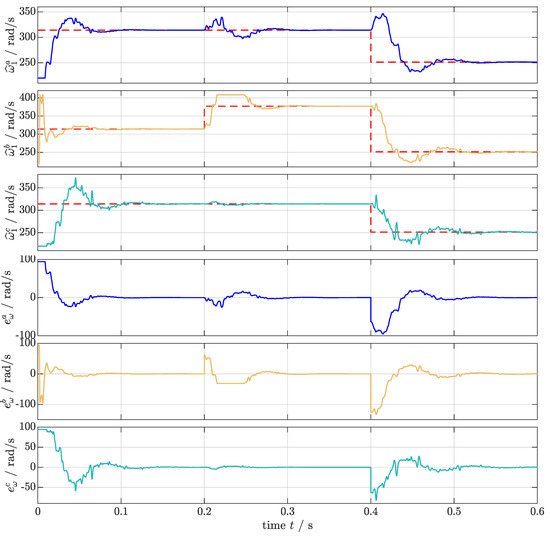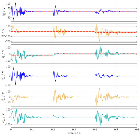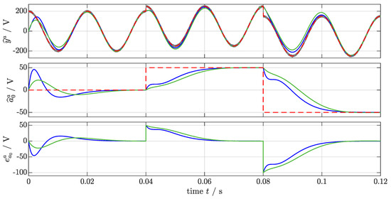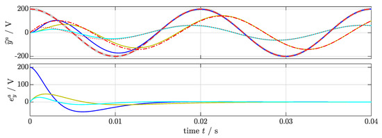 Note that matrix and vector are constant; nevertheless, due to a possibly time-varying estimate of the fundamental angular frequency, the overall dynamics of the parallelized SOGIs are time-varying. The output of the parallelized SOGI system is the direct component of the estimated signal—that is,