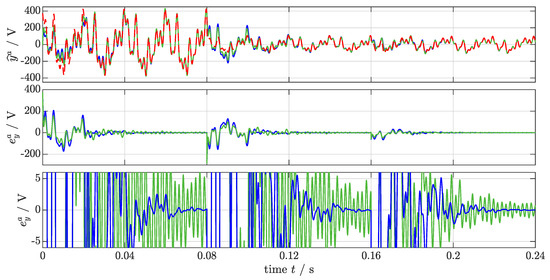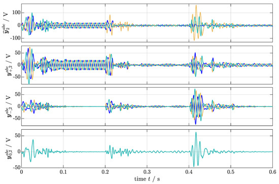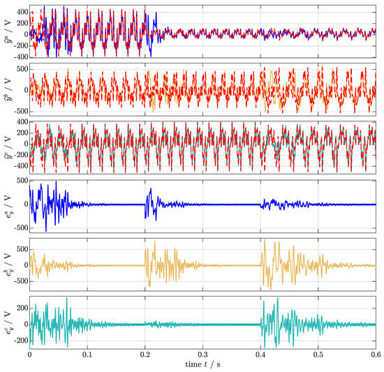 - to detect online estimates of DC-offset , amplitudes , and angles of the three phases for a limited bandwidth of the total harmonic distortion—that is, (where, clearly, the highest harmonic is smaller than —that is, ), such that, after a short transient phase, the estimated quantities (indicated by “ ”) are equal to the band-limited (low-pass and high-pass filtered; see Section 2.1 and Section 2.2) original signal. More precisely, the following should hold: