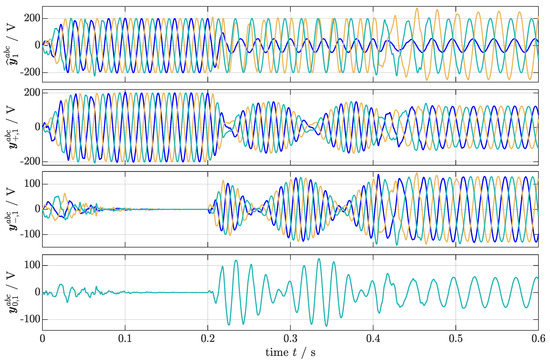 - and if the fundamental frequencies of the three phases are identical (i.e., for all ), to extract, for each harmonic , positive sequence components, negative sequence components (Positive and negative sequences are balanced signals, that is, for all and ([9], Appendix A)) and zero sequence components of the low-pass filtered and offset free harmonic signal vector as in (3) such that the following holds for all and (at least in the steady-state).
