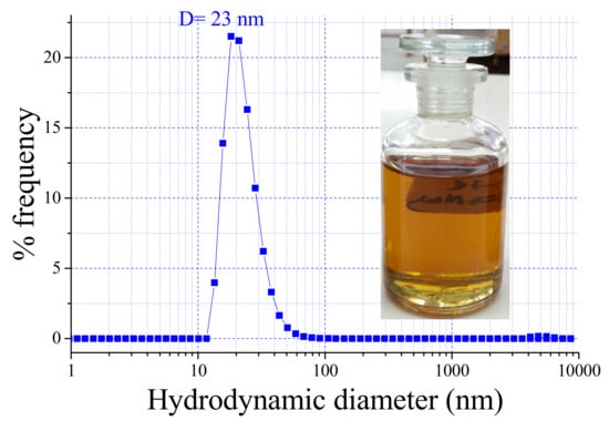 Size distribution diagram based on dynamic light scattering measurement of the colloidal magnetic iron oxides nanoparticles (MIONs) in the oil matrix and digital image colloidal nanofluid (colNF) after 2 months of storage (inset).