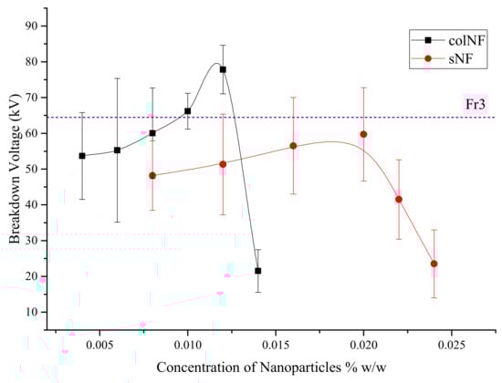 As regards the BDV of nanofluid with SiO2, nanoparticles (silica NF–sNF) exhibit similar behavior to the colNFs in terms of increasing nanoparticle concentration, although it always remains lower than the BDV of natural ester oil. The maximum BDV value of 59.7 kV is achieved at 0.02% w/w. Any further addition of silica nanoparticles results in an instant drop of the BDV.