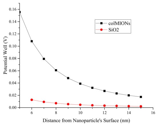 Taking into account Equations (3) and (4), as well as the values of Table 3, the potential well of the suspended colMIONs and SiO2 are given as [22]: