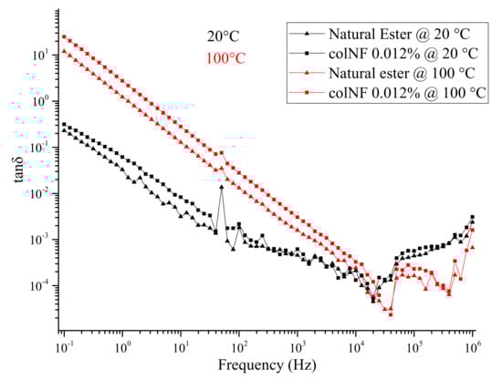Dielectric losses (tanδ) for natural ester oil and colNF 0.012% at 20 °C and 100 °C.