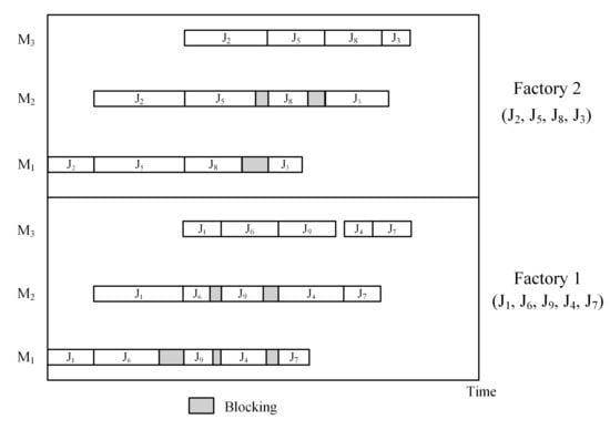In the above discussion, there always exists a universal hypothesis, as follows: The BFSP model is established on one production workshop, center, or factory, and all jobs are assumed to be processed in the same factory. In real life, however, the emergence of concurrent or large-scale production makes the pattern of distributed manufacturing necessary. This environment enables manufacturers to dispatch the general task among independent production units, with the view of raising productivity, lowering management risks, and reducing the manufacturing cost. We denote BFSP in a distributed environment as DBFSP (distributed blocking flowshop scheduling problem) throughout this paper. DBFSP contains multiple identical flow shops with a blocking constraint. That is, the machine configurations are the same in each flow shop. The processing time of one specific job on one fixed machine is the same as that on identical machines of other shops. The jobs can be assigned to any flow shops before the sequence of jobs in each shop are determined. Every single shop in such a distributed environment follows the character of a typical blocking flow shop. Figure 1 demonstrates an example of a Gantt chart for DBFSP with two factories.