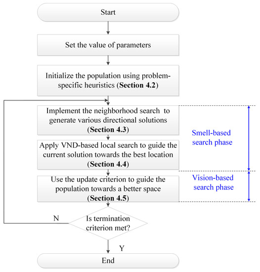 According to the algorithm structure, FOA has two search phases, as follows: The smell-based search phase and the vision-based search phase. This parallel search framework enables the researchers to embed a number of heuristics, local search strategies, and solution generation operators in it, so that the exploration and exploitation of the framework can be enhanced. Compared with other metaheuristics, FOA is simple and has few parameters to implement. The experiment results from many literature examples have reported that FOA is competitive and appropriate for optimization problems. The searching procedure of FOA is outlined in the following steps: