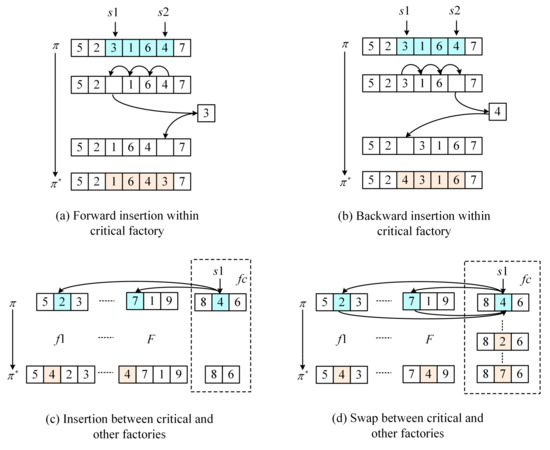 The solution generation operators are classified into two categories, as follows: One is based on the job sequence adjustment, including forward insertion and backward insertion within the critical factory; another one is based on the reassignment of jobs, including insertion and the swap between the critical factory and other factories. The four solution generation operators are depicted as follows. An example of the four solution generation operators is given in Figure 4.