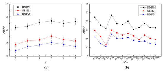 In addition, Figure 6a presents the mean plot, with a 95% confidence interval, of the three heuristics. It is clear that the overall ARPDs of DNPM stayed under NEH2 and DNRM without any overlapping for all factories, which reports that the DNPM performed significantly better than the NEH2 and DNRM from the statistical view. On the other hand, in Figure 6b, we can observe the behavior of the initialization methods with the size of the instances (n × m). As seen, the most influential factor is the number of machines in each factory. With the increment of m, the performances of all the initialization methods improved.